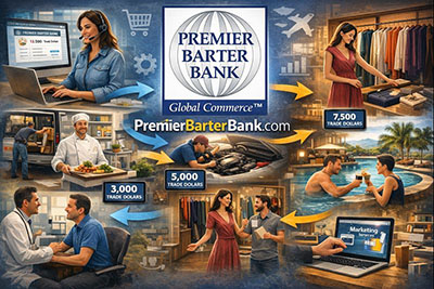 read morePremier Barter Bank, a partner in the world's premier Global Trade Alliance, gives you the resources you need to build your bottom line. Tens of thousands of business owners and professionals already trade in the alliance. Earn Trade Dollars from...
